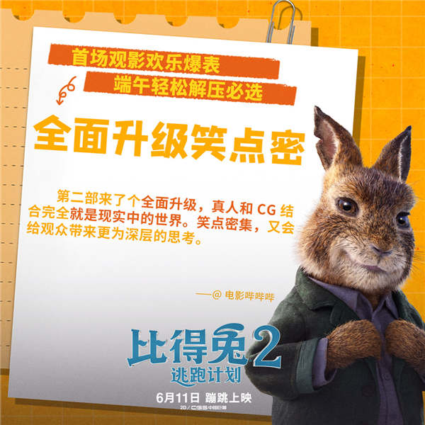 近日,由美国索尼哥伦比亚影片公司出品的喜剧动画电影《比得兔2:逃跑计划》在多城市举办了提前观影,观影现场氛围轻松欢乐,萌兔天团反差萌制造无数欢乐,引得全场多次爆笑,观影结束后观众们也纷纷评价电影“全年龄无门槛”、“笑点多如兔毛”“太欢乐了、强推”, 对于郭麒麟的中文版配音他们更表示惊喜不已。电影将于6月11日在全国上映,端午假期轻松解压首选,预售正火热进行中。
