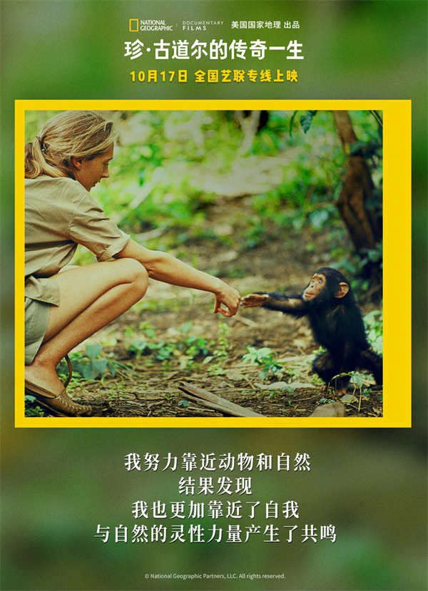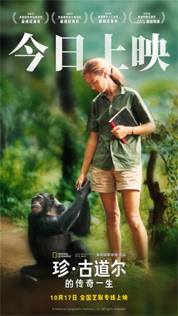 10月17日,由中影/华夏联合发行、国家地理出品的纪录电影《珍·古道尔的传奇一生》(Jane)在全国艺联专线正式上映。影片展现了20世纪伟大女性探险家珍·古道尔的非洲荒野探秘之旅。她不受世俗眼光干扰、不被既定观念捆绑,一直坚定勇敢地探寻她向往的世界,不仅为保护地球作出杰出的贡献,更是深受全世界自然动物保护者的爱戴的女神。直至今日,珍·古道尔仍然在世界各地呼吁动物保护。